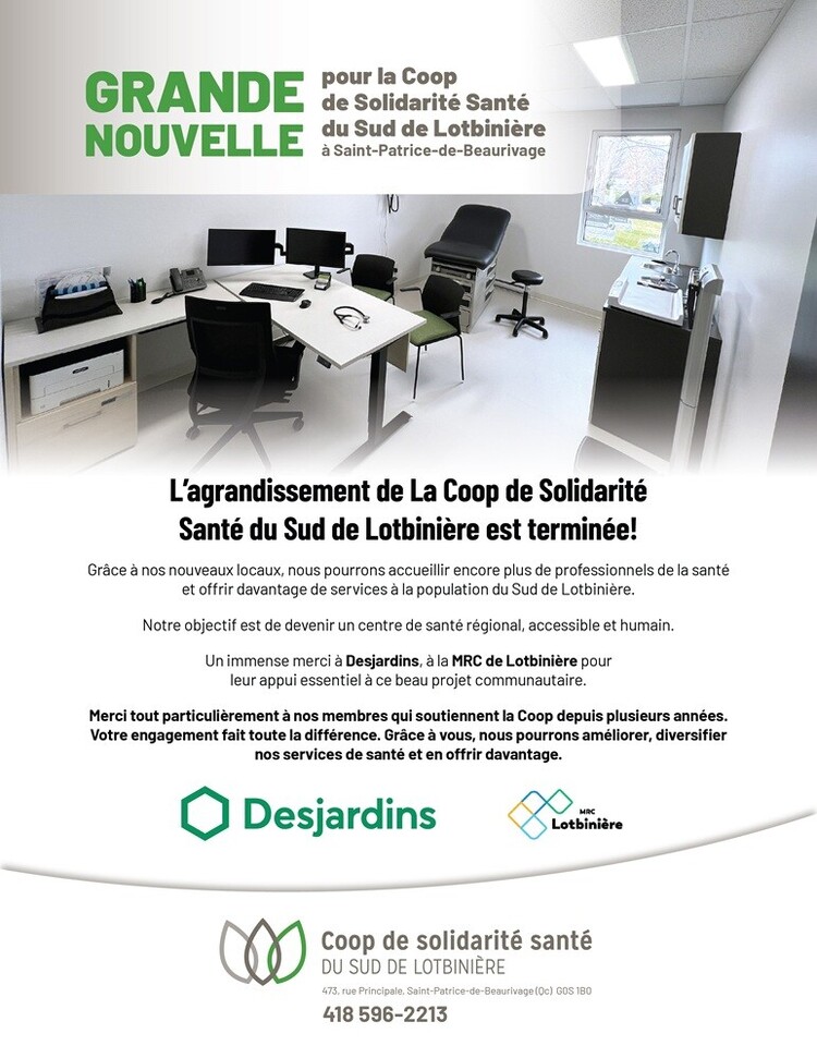 La Coop de solidarité santé du Sud de Lotbinière offre des services diversifiés : une travailleuse sociale et une nutritionniste se sont ajoutées à l'équipe soignante et des traitements de physiothérapie sont maintenant offerts à la Coop. Sans elle, cet ajout de services aurait été impossible.