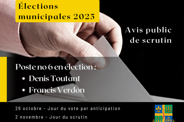 Par cet avis public, Annie Frenette, présidente d'élection, annonce les éléments suivants aux électrices et aux électeurs inscrits sur la liste électorale municipale.