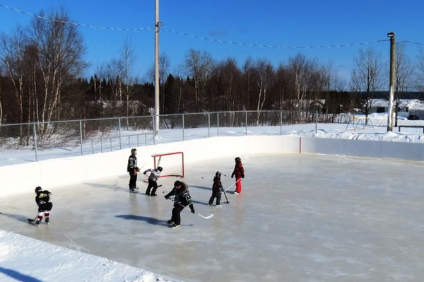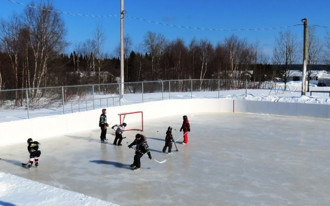 Notez que la patinoire (avec bandes) est réservée à la pratique de hockey et la surface glacée à côté est pour le patinage libre.